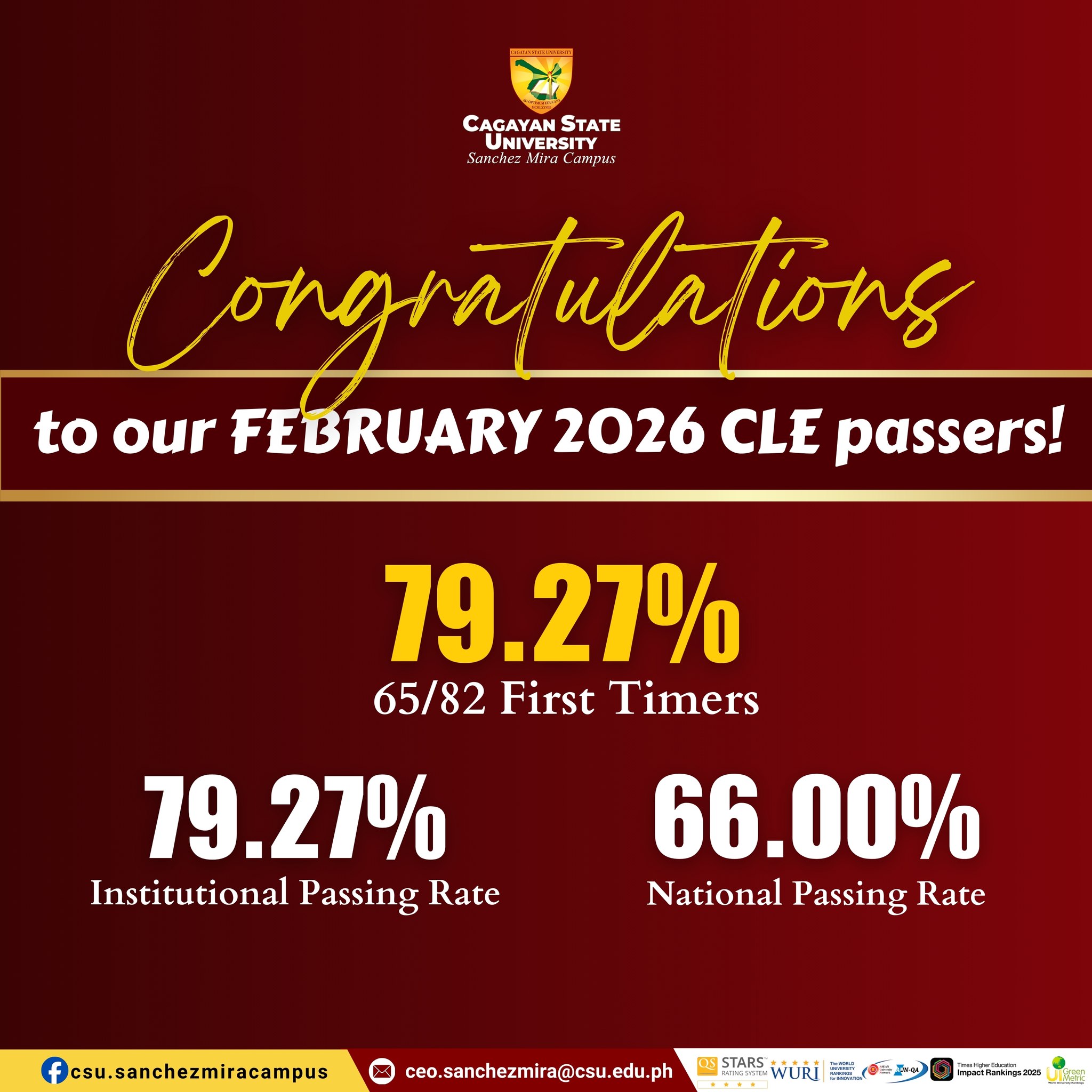 Cagayan State University–Sanchez Mira Campus, through the College of Criminal Justice Education (CCJE), celebrates another milestone after achieving a 79.27% institutional passing rate (65 out of 82 first-time takers) in the February 2026 Criminology Licensure Examination, surpassing the 66.00% national passing rate.