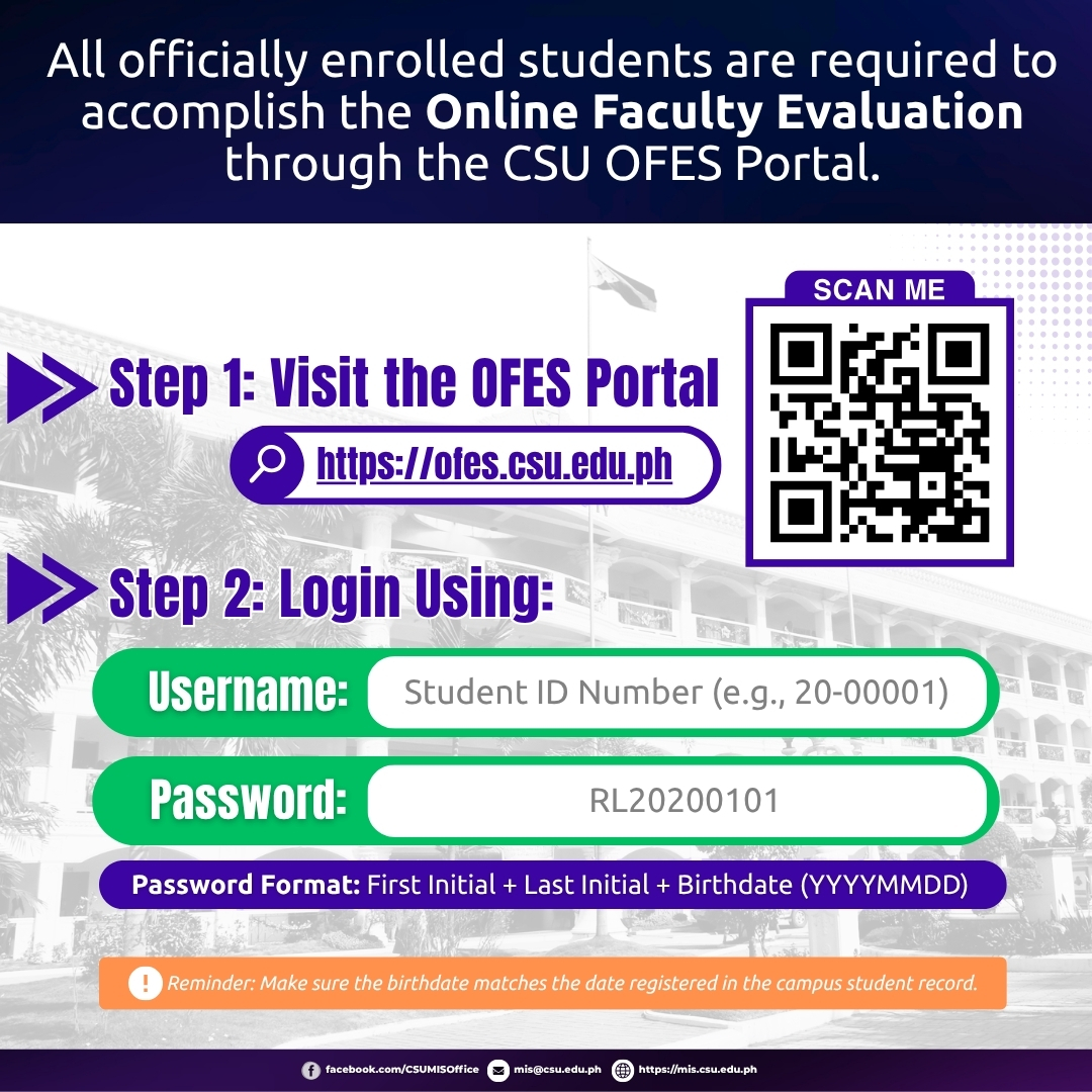 Cagayan State University informs all students of ๐๐ฎ๐น-๐น๐ผ ๐๐ฎ๐บ๐ฝ๐๐, ๐๐ฎ๐๐ฎ๐บ ๐๐ฎ๐บ๐ฝ๐๐, and ๐ฆ๐ฎ๐ป๐ฐ๐ต๐ฒ๐ ๐ ๐ถ๐ฟ๐ฎ ๐๐ฎ๐บ๐ฝ๐๐ that the Online Faculty Evaluation System (OFES) is now accessible.