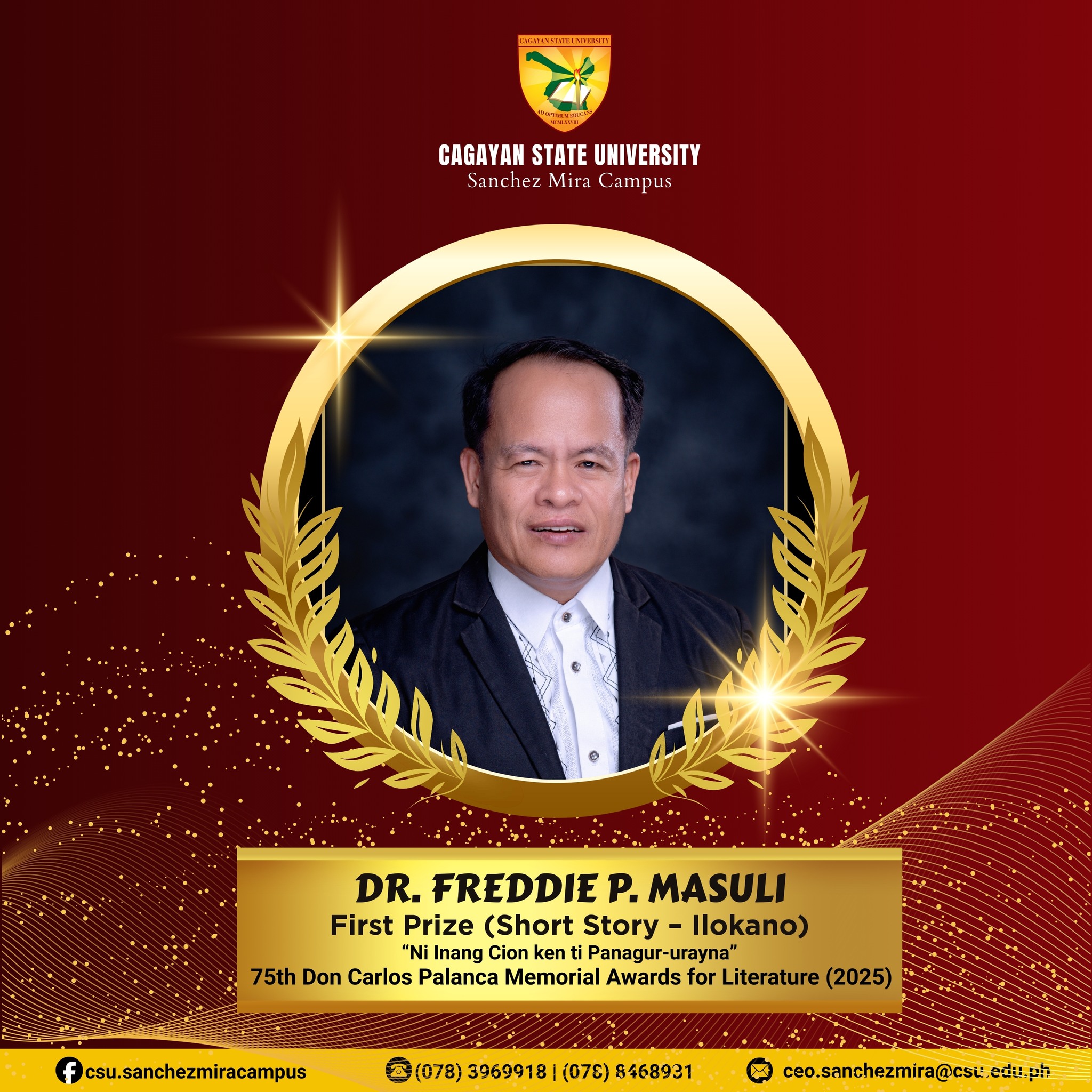 CSU-Sanchez Mira proudly celebrates the achievement of Freddie Padua Masuli, who won the First Prize at the 75th Don Carlos Palanca Memorial Awards for Literature (2025)—the most prestigious literary award in the Philippines.